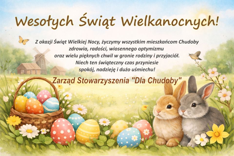 Zarząd Stowarzyszenia na Rzecz Rozwoju Wsi „Dla Chudoby” zwraca się z prośbą do wszystkich, którym na sercu leży dalszy rozwój Chudoby, o przekazanie nam 1,5 % podatku w rozliczeniu z urzędem skarbowym za rok 2025. Pozyskane w ten sposób pieniądze przeznaczymy na dofinansowanie podejmowanych przez nas działań mających na celu realizację celów statutowych Stowarzyszenia. Przekazane przez Państwa środki przyczynią się do dalszej poprawy jakości życia w naszej miejscowości, a co za tym idzie dalszego jej rozwoju. Osobom, które zdecydują się na przekazanie nam swojego 1,5% podatku serdecznie dziękujemy.